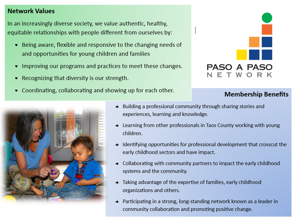 Paso a Paso a network of community organizations and individuals in Taos County that support families with young children, from prenatal stage to eight years old. Network members represent health, behavioral health and family support services; early childhood education and care, special needs and early intervention. Paso a Paso is a mechanism for those organizations to build relationships to coordinate efforts and collaborate on initiatives that ensure high quality services as well as communicate the importance of the early years to our community. Paso a Paso Network members respect families as their children’s first teachers, that young children be valued as our youngest citizens.